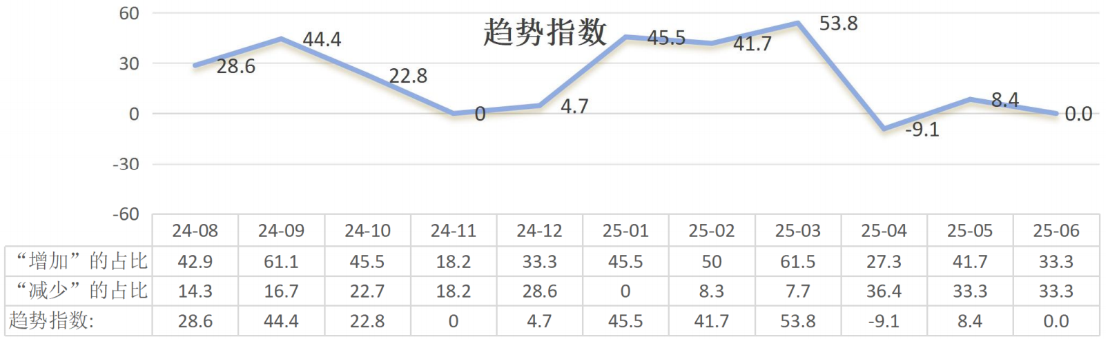 主动削减材料采购并降低材料库存,反映谨慎情绪。趋势指数反映企业展望严重分化——预测未来6个月活动提